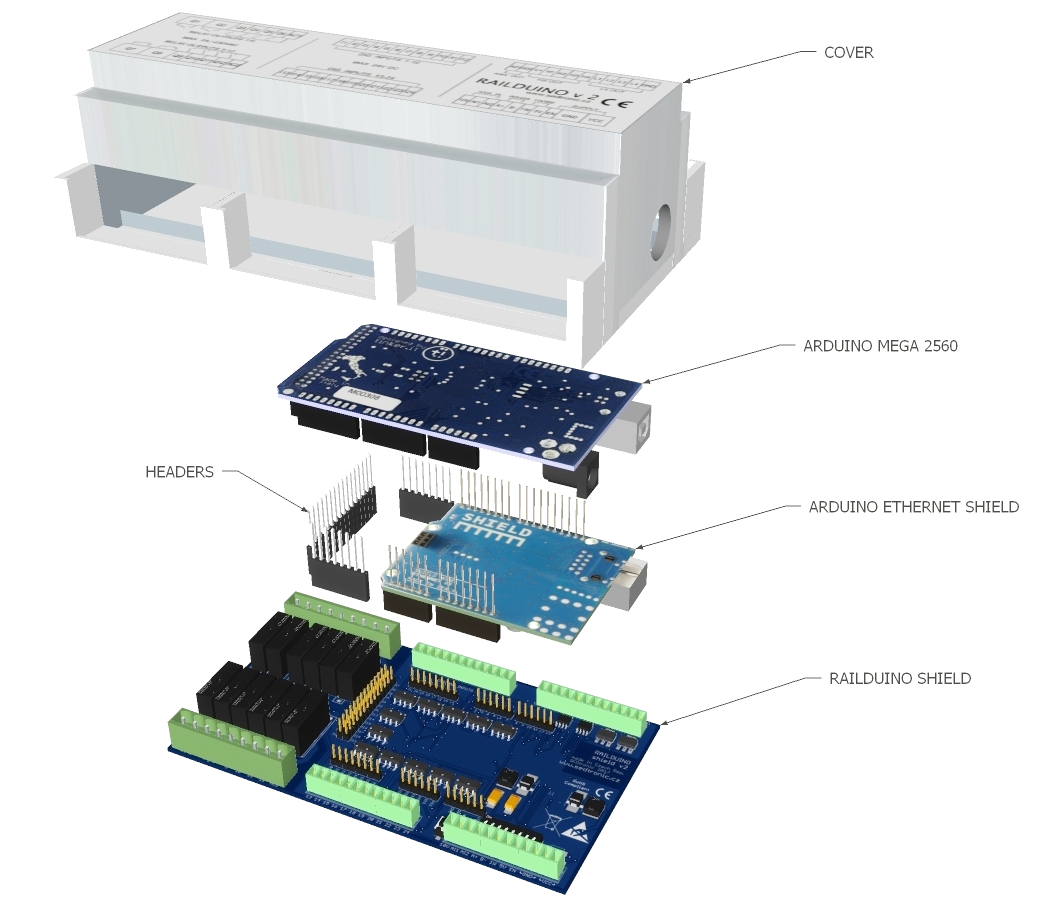 module is equipped with header connectors between the Ethernet shield and the Railduino shield.