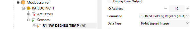 Insert new Modbus analog sensor with the settings IO address "19", Command "3", data type "16-bit signed int"