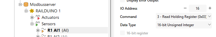 Insert new Modbus analog sensor with the settings IO address "16", Command "3", repeat cycle "5"