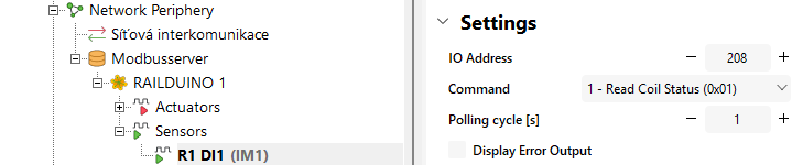 Insert new Modbus digital sensor with the settings IO address "208", Command "1", polling cycle "1"