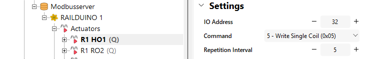 Insert new Modbus digital actor with the settings IO address "32", Command "5", repeat cycle "5"