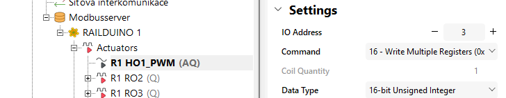 Insert new Modbus analog actor with the settings IO address "3", Command "16", data type "16-bit unsigned int"