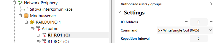 Insert new Modbus digital actor with the settings IO address "0", Command "5", repeat cycle "5"